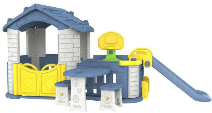 5 az 1-ben Kerti Játszóház: Csúszda, Kosárpalánk és Még Több Szórakozás! ?? Ez a fantasztikus 5 az 1-ben kerti játszóház tökéletes hely a gyerekek számára, hogy aktívan és kreatívan töltsék az időt a szabadban vagy akár a szobában! A csúszda, a kosárpalánk, az asztal székekkel, a kert és a tágas házikó mind-mind garantálják a változatos és izgalmas játékot. Főbb Jellemzők:5 az 1-ben: Házikó, csúszda, kosárpalánk, asztal székekkel, és bekerített kert. Nagy tér a házban: Biztosítja a szabad és kényelmes játékot. Széles, strapabíró csúszda: Beépített előszoba átjáróval a házba. Kosárlabda palánk: Labdajátékhoz. Asztal és 2 szék: Tökéletes piknikezéshez vagy rajzoláshoz. Bekerített kert: További játéklehetőségeket kínál. Anyag és Biztonság:Kiváló minőségű HDPE anyag: Rugalmas és ellenáll a mechanikai sérüléseknek. Kettős műanyagrétegű falak: Lehetőség a falak homokkal való feltöltésére a nagyobb stabilitás érdekében. Magas minőségű kivitelezés: Biztosítja a gyermek biztonságos játékát. Méretek:Méret Érték (cm)Ház magassága 128Teljes hossza 239.5Szélesség asztallal 155Csúszda mérete 110 x 38Kerítés magassága 55Asztal magassága 40Asztal hossza 47Kosárlabda palánk magassága 83Kert belső méretei 70 x 95Belépési mérete 50 x 97További Előnyök:Könnyű összeszerelés: A nagy alkatrészek megkönnyítik az összeszerelést. Beltéri és kültéri használatra: Tökéletes a gyerekszobában, a kertben vagy a strandon. Ez a sokoldalú játszóház garantáltan órákig leköti a gyerekeket, miközben fejleszti a kreativitásukat és a mozgáskoordinációjukat! ?